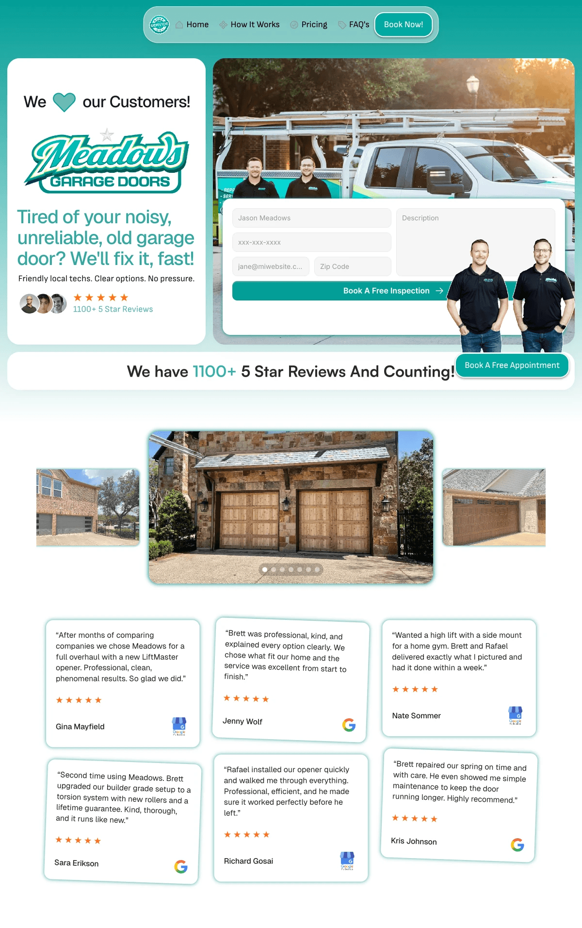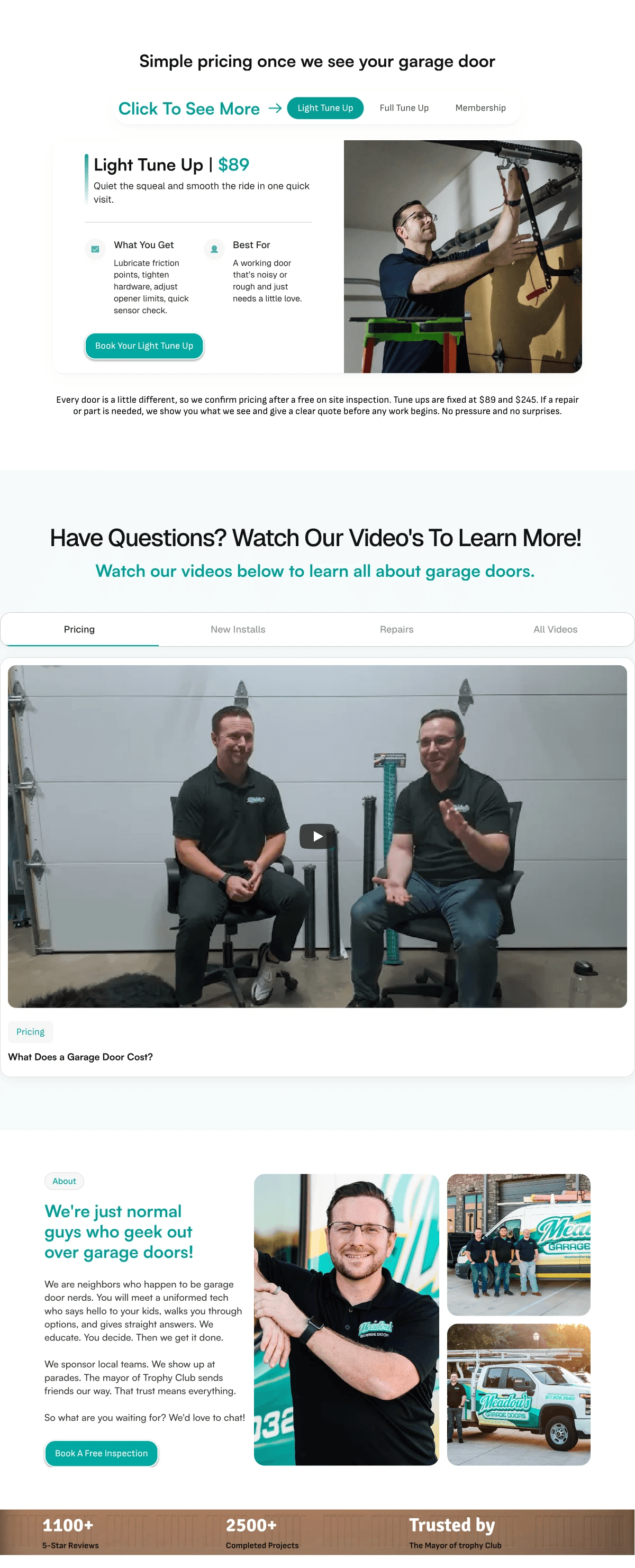 For Meadows Garage Door, the website needed to feel as friendly and reliable as the team behind the name. We focused on creating a digital experience that’s as welcoming as a neighbor’s wave—clean layouts, bold colors, and instant booking features. This website page is designed to make homeowners feel at ease, with clear calls to action and mobile-friendly navigation that works for busy families on the go.